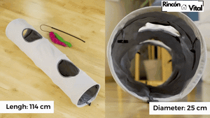 👉 El túnel mide aproximadamente 114 cm de largo y 25 cm de diámetro, ofreciendo espacio suficiente para que tu mascota juegue y descanse cómodamente.