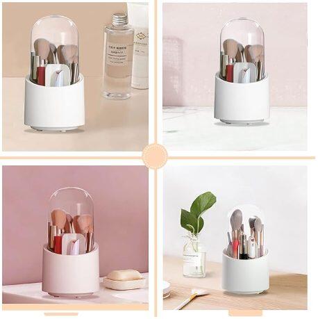 Este organizador giratorio de 360 grados con tapa es ideal para mantener tus pinceles de maquillaje y otros accesorios en orden y libres de polvo. Su diseño moderno con una cubierta acrílica transparente no solo lo hace visualmente atractivo, sino que también protege los objetos almacenados del polvo y la humedad. La base giratoria te permite acceder fácilmente a tus herramientas, girando el organizador hasta el ángulo que prefieras.